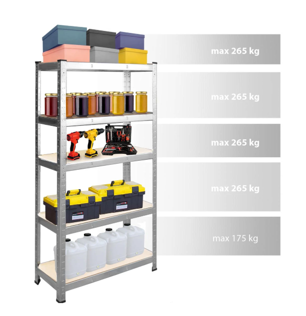 Stelažas turi 5 lentynas, ant kurių galite sudėti gaminius, dėžes ar įrangą, maksimaliai apkraunant kiekvieną lentyną iki 200 kg.